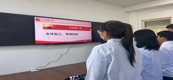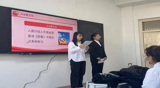 儀式在莊嚴(yán)的國(guó)歌聲中拉開序幕,首先由主持人宣讀了新團(tuán)員名單。隨后,團(tuán)總支老團(tuán)員代表向四名新團(tuán)員頒發(fā)團(tuán)證、佩戴團(tuán)徽。佩戴著嶄新的團(tuán)徽,四名新團(tuán)員在老團(tuán)員代表的帶領(lǐng)下,面對(duì)團(tuán)旗,握拳舉起右手,莊嚴(yán)宣誓:“我志愿加入中國(guó)共產(chǎn)主義青年團(tuán),堅(jiān)決擁護(hù)中國(guó)共產(chǎn)黨的領(lǐng)導(dǎo),遵守團(tuán)的章程,執(zhí)行團(tuán)的決議,履行團(tuán)員義務(wù),嚴(yán)守團(tuán)的紀(jì)律,勤奮學(xué)習(xí)……”新團(tuán)員的宣誓慷慨激昂,表達(dá)了他們堅(jiān)定的信念。宣誓過后,由入團(tuán)介紹人趙昱同學(xué)為新團(tuán)員宣讀團(tuán)員的權(quán)利與義務(wù)、團(tuán)員應(yīng)遵循的規(guī)章制度,隨后,新團(tuán)員代表尚哲龍和老團(tuán)員代表先后發(fā)言,老團(tuán)員代表發(fā)言中表達(dá)了對(duì)新團(tuán)員的熱烈祝賀和殷切希望,新團(tuán)員代表則表示一定時(shí)刻牢記入團(tuán)誓詞,刻苦學(xué)習(xí)、努力拼搏、爭(zhēng)取早日成為社會(huì)主義合格的建設(shè)者和可靠的接班人。